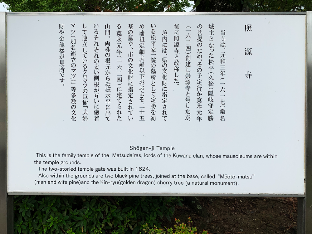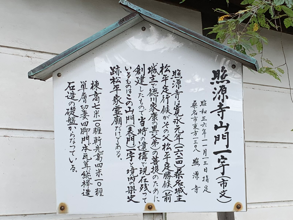 東海山泥洹院と号す。浄土宗。桑名藩主・松平(久松)定勝が寛永元(1624)年に亡くなったので、創建した。その後も松平(久松)家の菩提寺として続いた。戦災に遭わなかったので、古い風情を残している。山門(市指定文化財)は創建当時の建物。本堂は明治23(1890)年の改築。